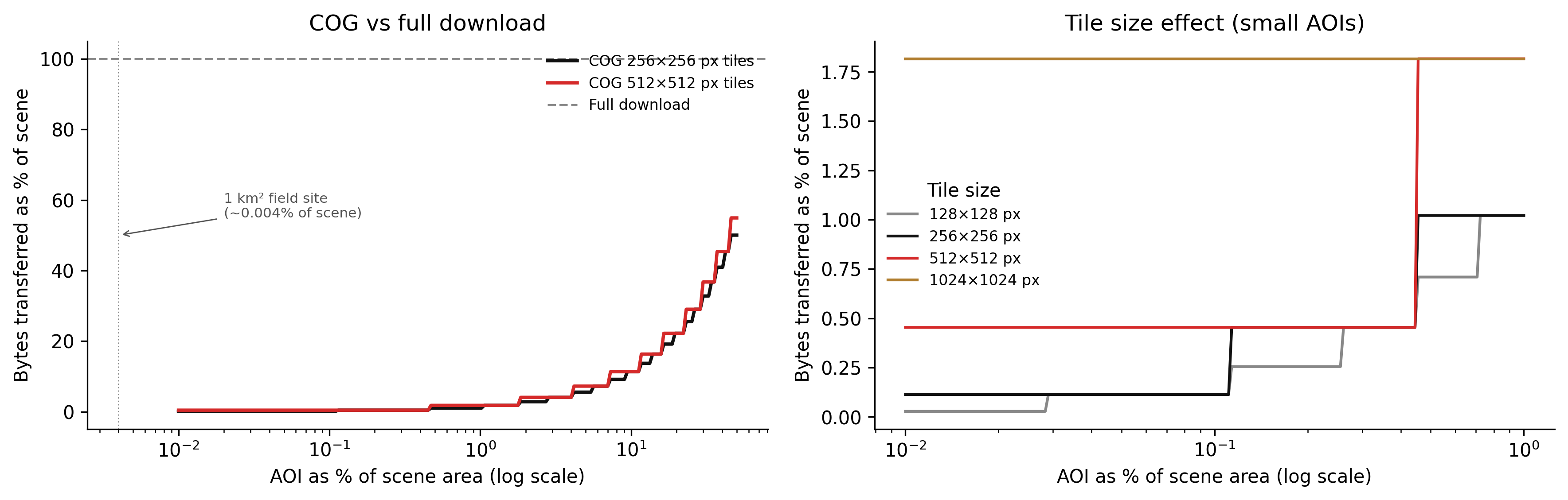 Figure 5.1: Figure 4.1. COG range request efficiency as a function of AOI size. Left: fraction of scene bytes transferred for a COG (tiled) versus a full-file download, across AOI fractions from 0.001% to 50% of the scene. The COG efficiency degrades as AOI size increases because more tiles must be fetched, including tile edges that extend beyond the AOI boundary. At very small AOI fractions, COG overhead is dominated by the header read and a small number of tiles. Right: effect of tile size on efficiency for small AOIs. Larger tiles are less efficient for small AOIs because each tile read includes more outside-AOI data.