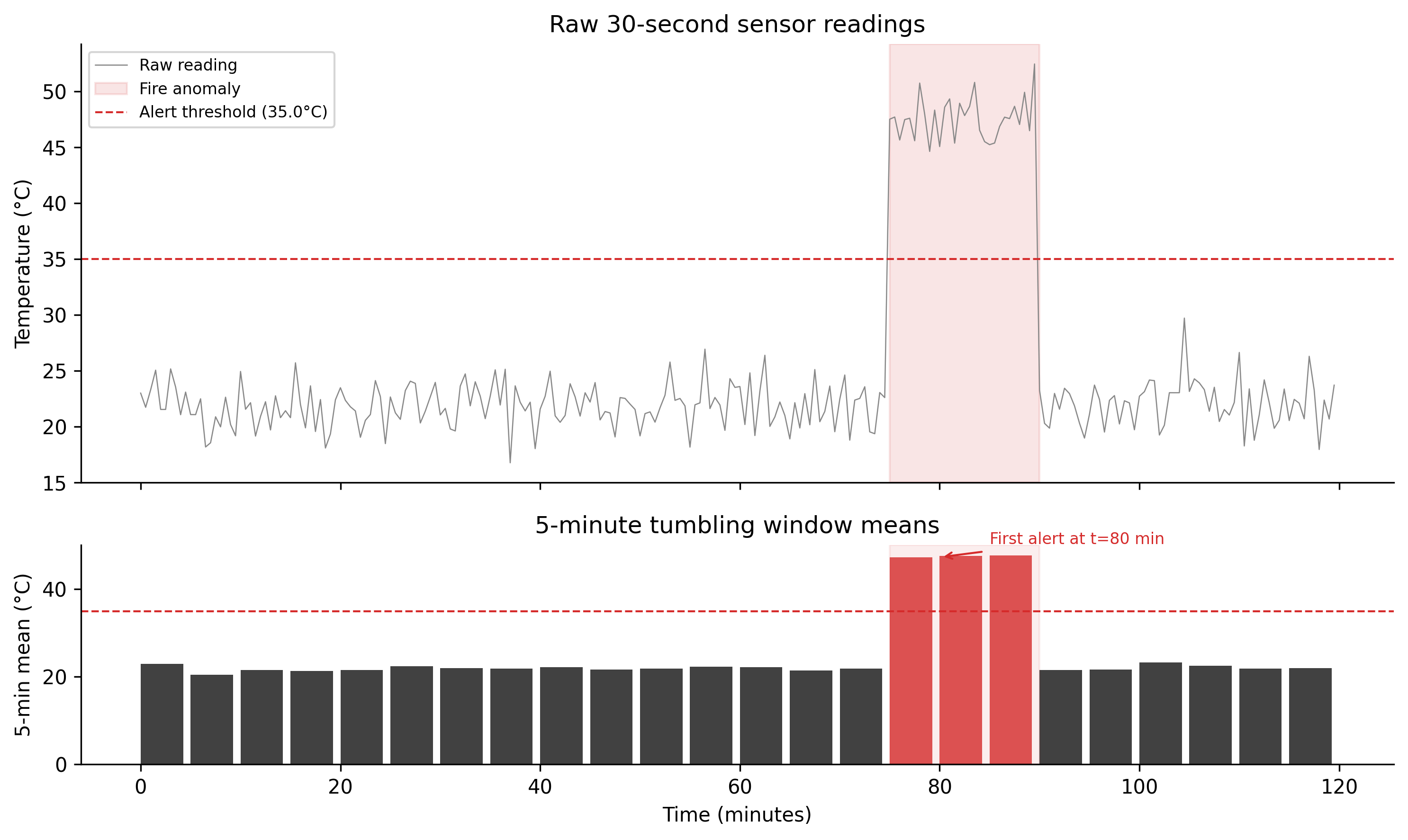 Figure 6.1: Figure 5.1. Windowed sensor aggregation. Top panel: raw 30-second temperature readings for a simulated 2-hour period. Gaussian noise (σ = 2°C) overlays a baseline of 22°C. A fire anomaly is injected at t = 75 minutes, raising temperature by 25°C for 15 minutes. Bottom panel: 5-minute tumbling window means. The anomaly window mean exceeds the alert threshold (35°C) within the first full window after ignition, at t = 80 minutes — 5 minutes after onset. Compare this with the 60-minute batch interval that produced the original failure.
